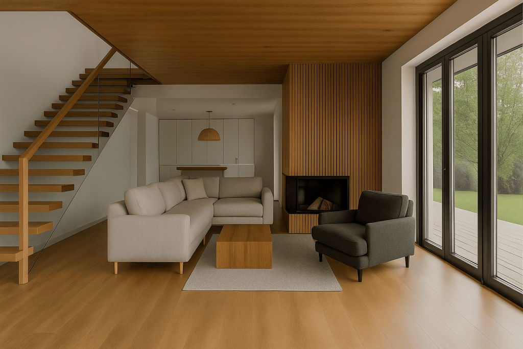 Lantai kayu memberikan kesan hangat dan mewah. Material ini cocok untuk ruang tamu, kamar tidur, hingga area keluarga.